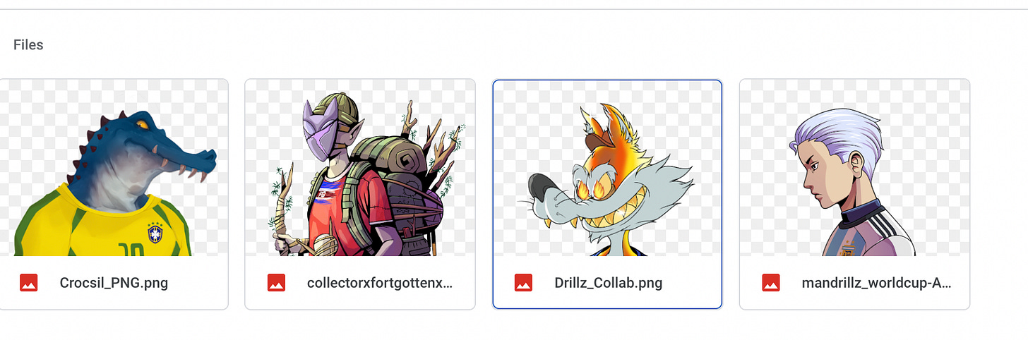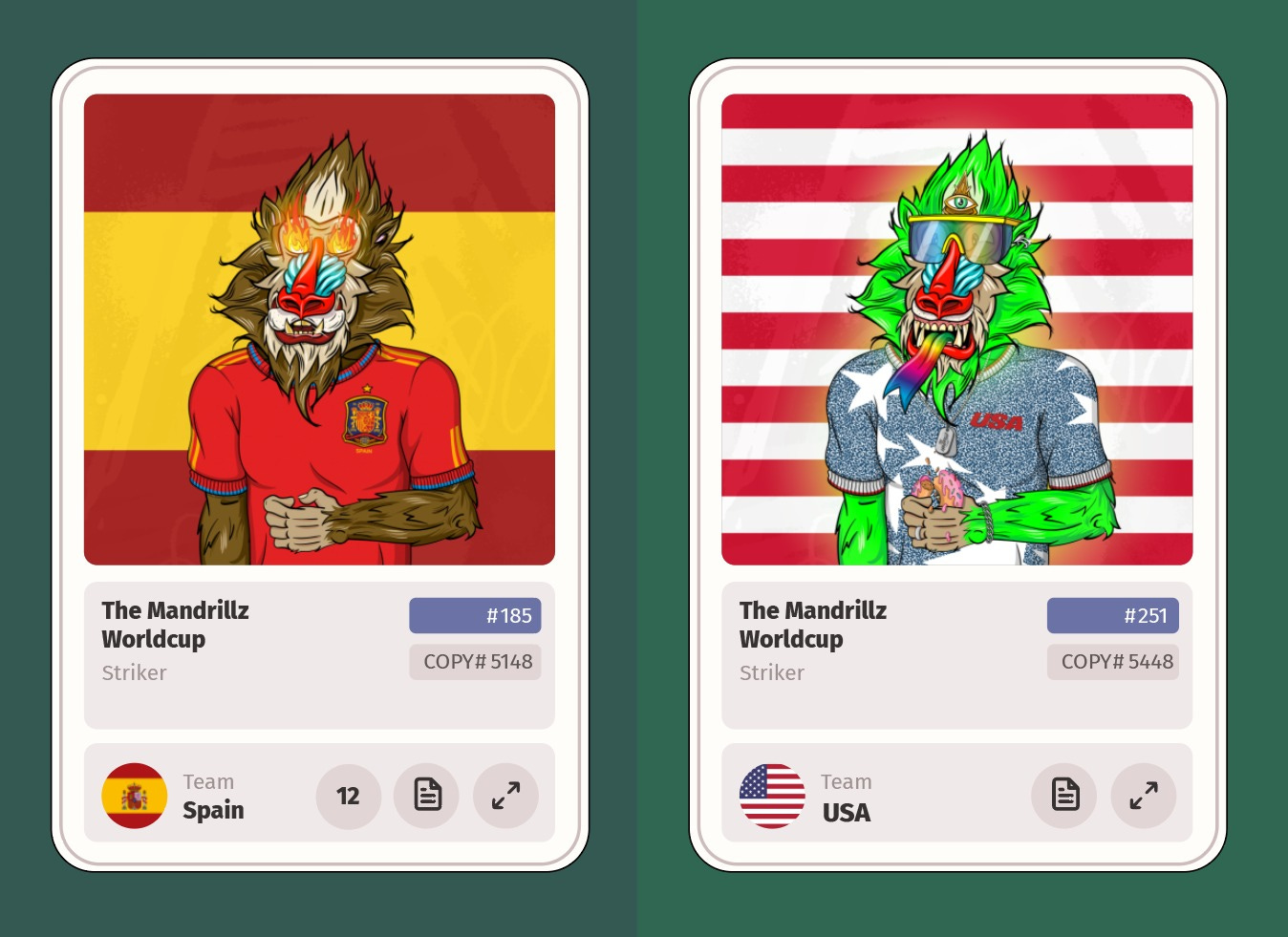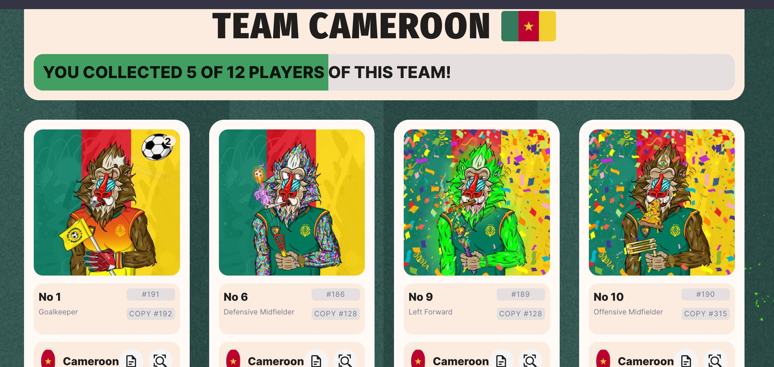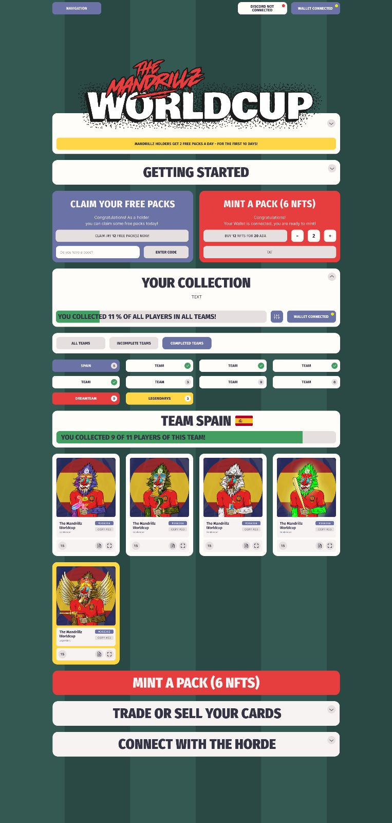 To view your personal cards The Mandrillz team has created a slick World Cup portal. Here you can see all teams, how many you have collected already and how many are still missing for each team. There will also be Duplicates you can easily share with other Drillz in our Discord, Jpg.store and other marketplaces as well as Trading Tent, our exclusive partner for this World Cup event.
