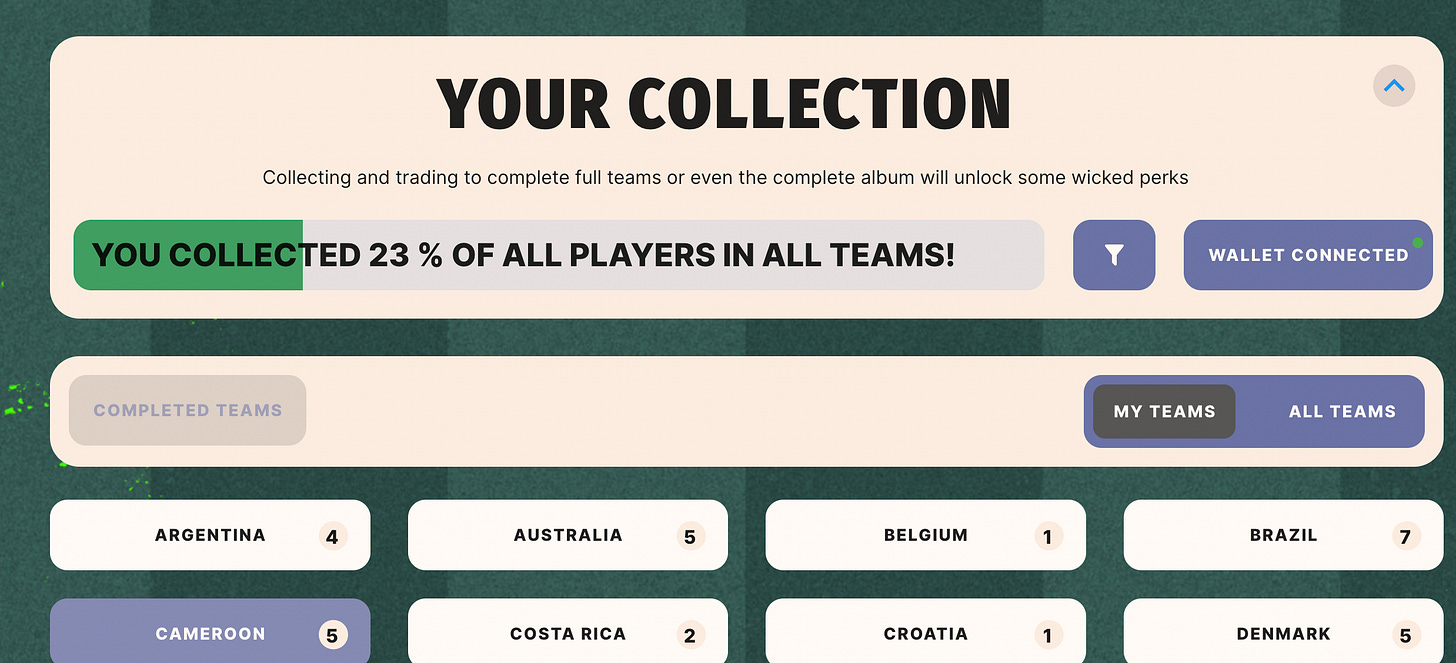The complete album is made of 32 teams, consisting of 11 players in each team, for a total of 352 unique Player NFTs to trade, collect, and sell.